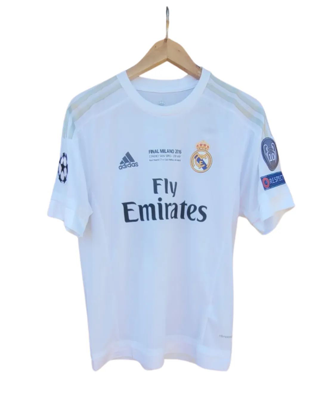 Camiseta Real Madrid Adidas Cristiano Ronaldo Final San Siro manga corta, un artículo imprescindible para coleccionistas y fanáticos del fútbol. Esta prenda conmemora la final de la UEFA Champions League 2016 en San Siro, donde el Real Madrid levantó la Orejona en un histórico partido frente al Atlético de Madrid. Con el nombre y dorsal oficial de Cristiano Ronaldo (CR7), máximo goleador del torneo y figura legendaria del club, esta camiseta representa uno de los momentos más memorables de la era reciente merengue.