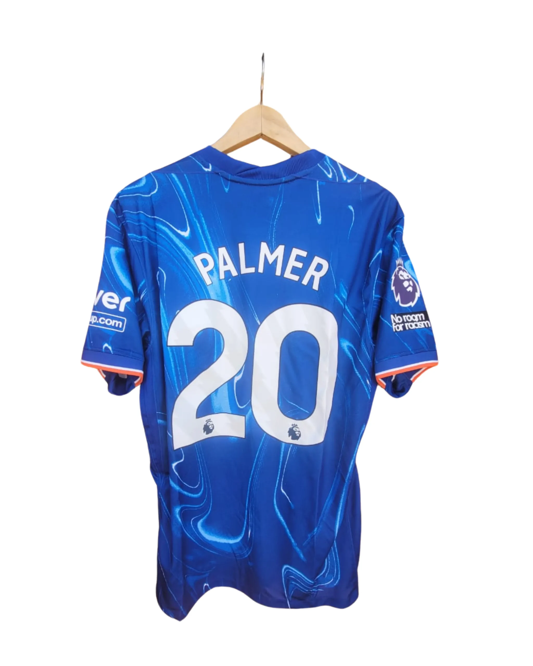 Con un diseño moderno y sofisticado, mantiene el tradicional azul royal del Chelsea, realzado con detalles plateados y líneas minimalistas que simbolizan innovación y ambición. El escudo bordado en alta definición destaca en el pecho, acompañado por el número y nombre de Palmer, impresos con tecnología de última generación para máxima durabilidad.